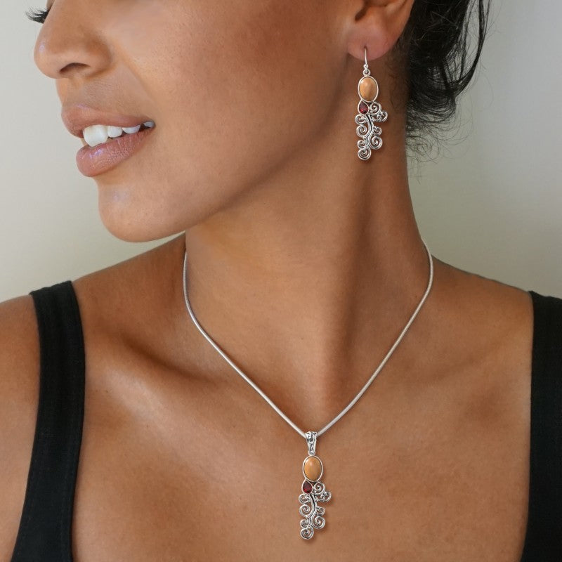 We selected fossilized walrus tusk ivory as the focal points for these earrings, cradling them with garnet accents and sterling silver tendrils. Fossilized walrus ivory is an ancient ivory that has lain for centuries in the earth. Erosion and the tides expose it where it can be gathered by indigenous peoples and worked into jewelry or other art objects.