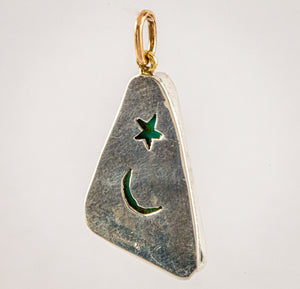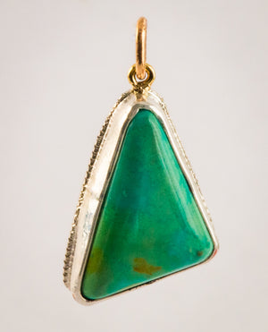 This turquoise is from the Rollins mine in the Cerillos mountains 20 miles south west of Santa Fe New Mexico. It was known for it's dense turquoise. This mine closed in 1925 and it came to me from a collection. The bezel is fine silver with 14kt bail.