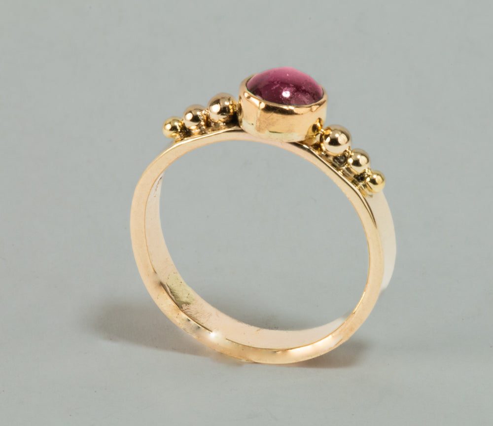 A 6mm .90ct natural star ruby set in a 22 kt bezel on a 14kt band with accent beads. The current size is 7 and includes sizing.