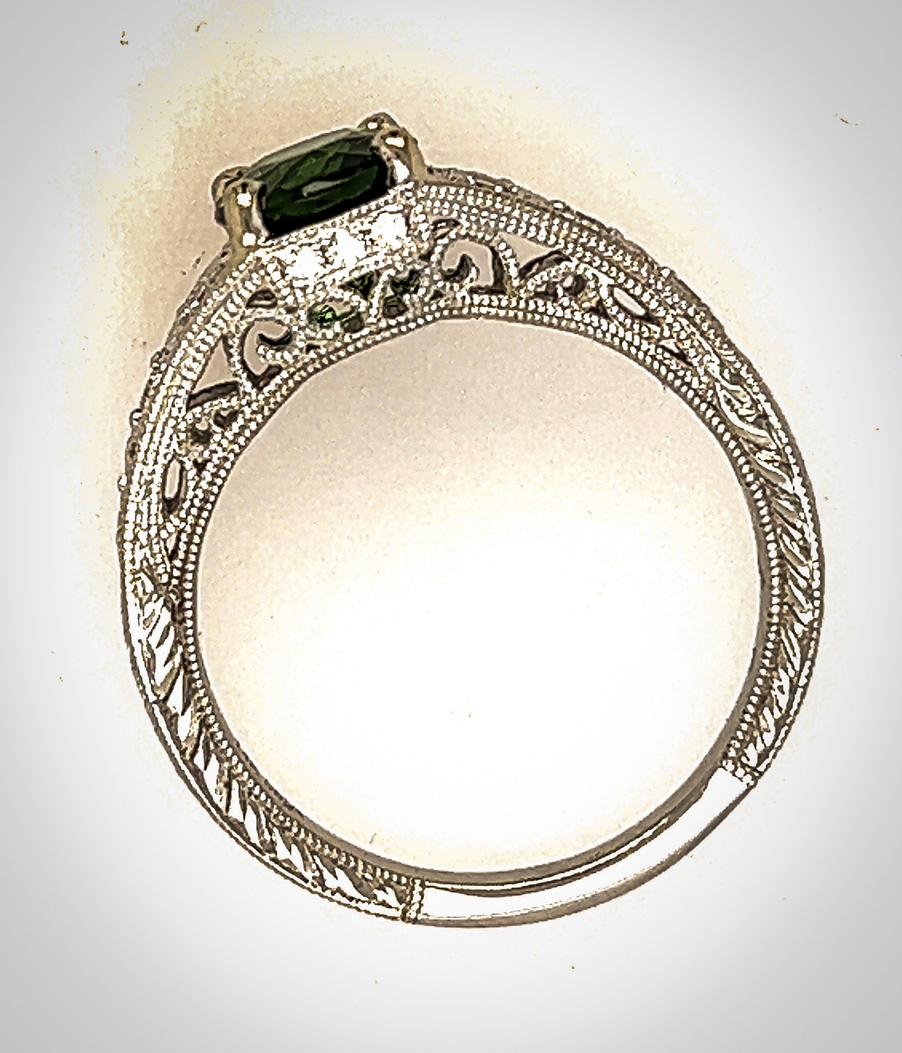 A 14 karat white gold ring with a green tourmaline measuring 7.8mm x 6.4mm with a weight of 1.44ct. This ring is set with 14 full cut diamonds with a total weight of .16 carat. The current size is 6 1/2 and includes sizing.