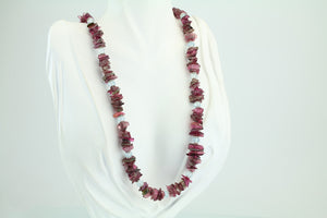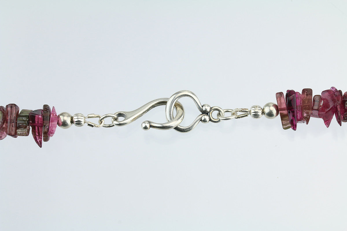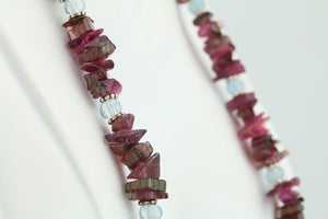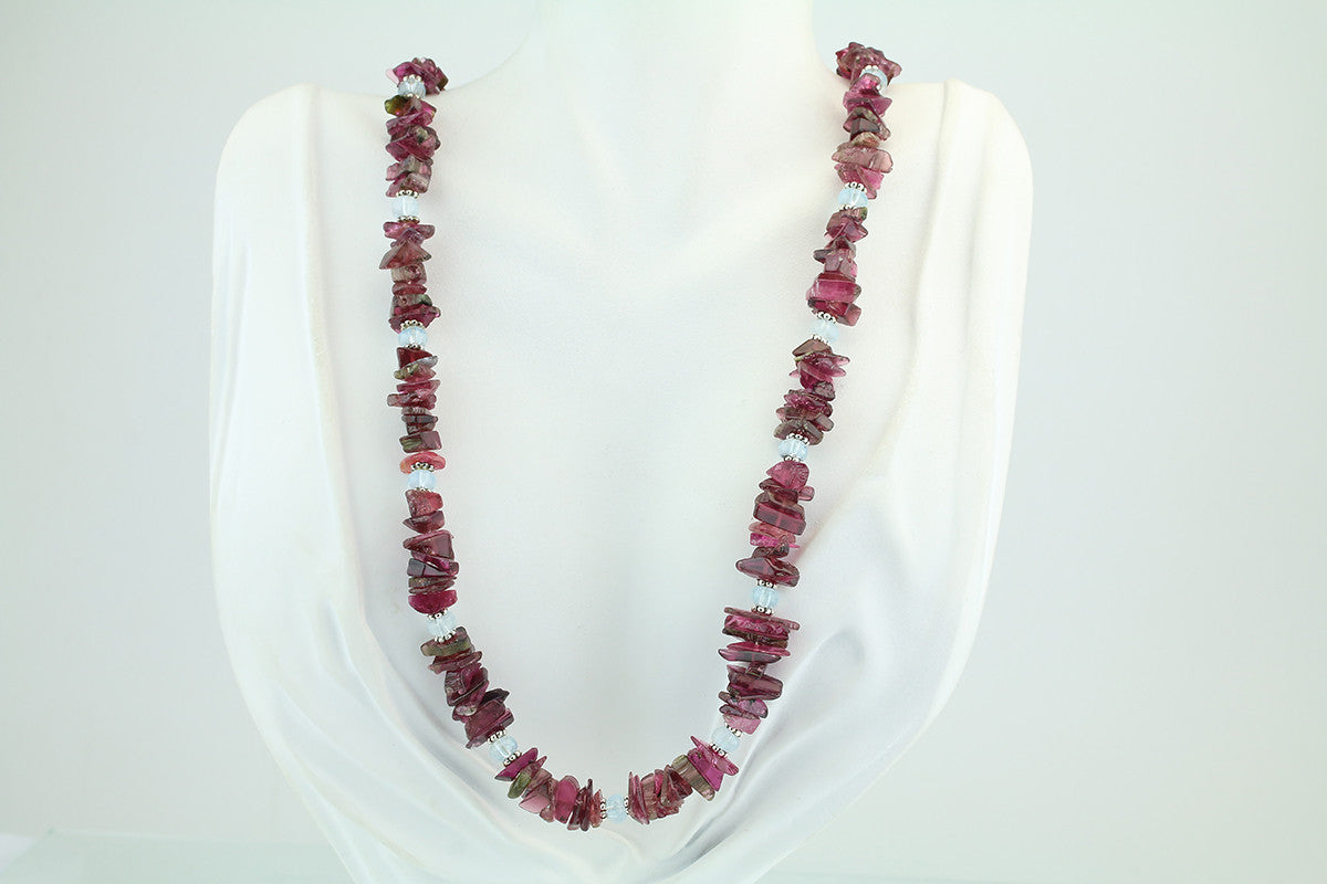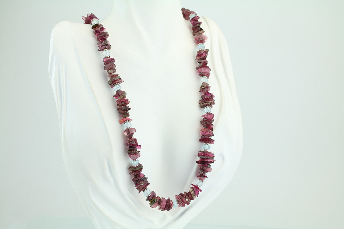 This long strand of gemstone beads features dark pink tourmaline chips and round aquamarine beads with sterling silver spacers. The chips are 10-12mm and the aquamarine beads are 6mm. The length of the necklace is 24" and is finished with a sterling silver hook and eye clasp.