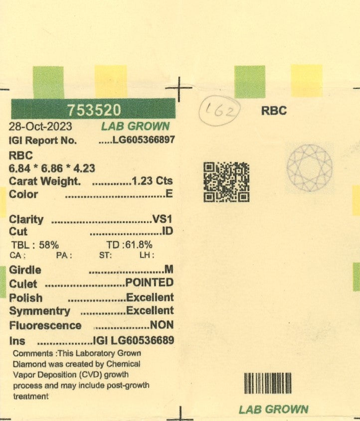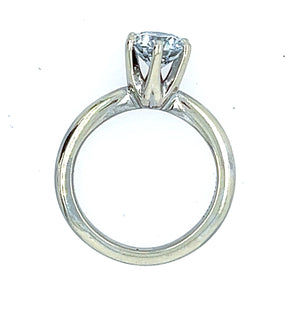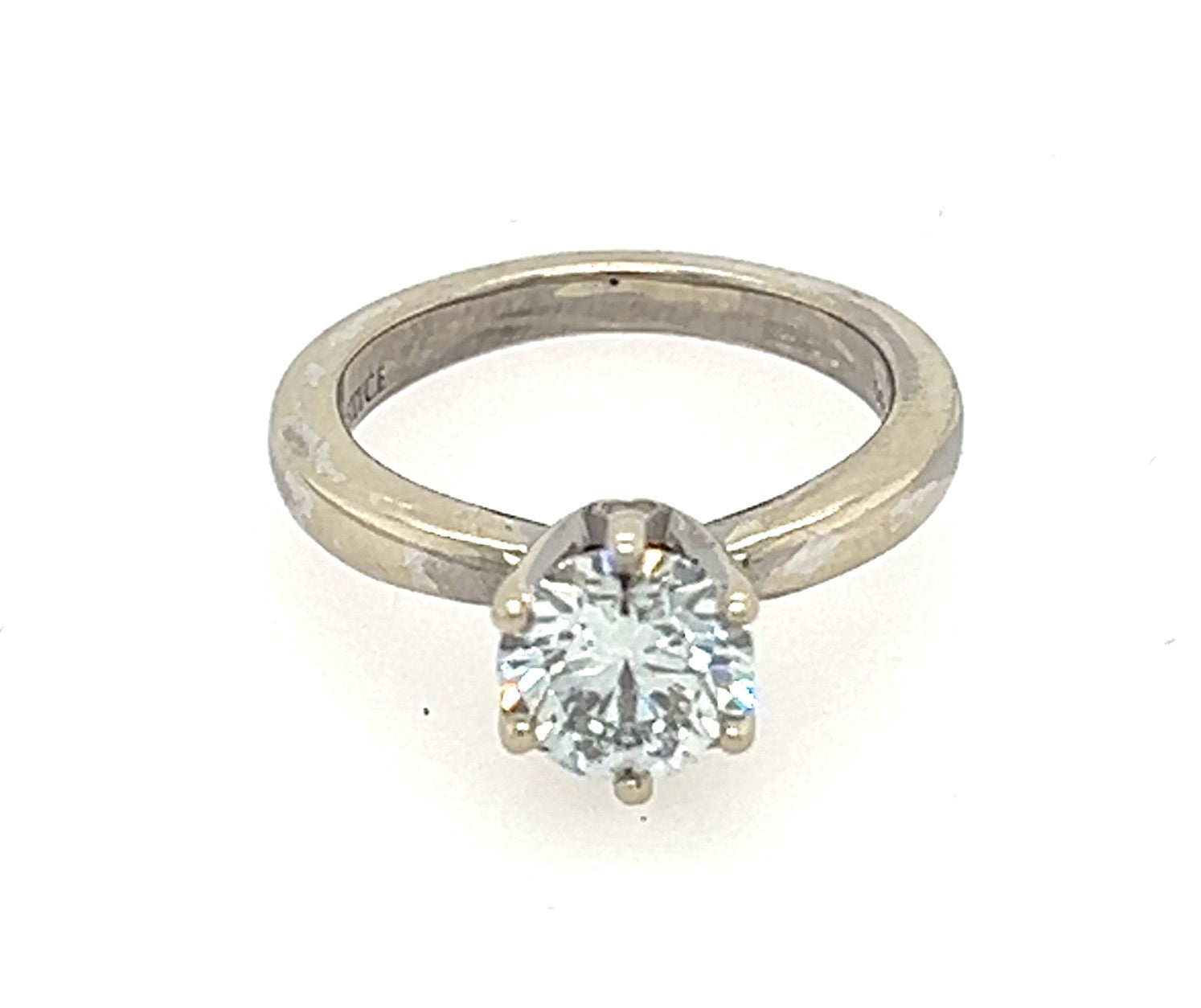 A lab diamond with a weight of 1.23 carat, a color of E and clarity of VS1 and is an ideal cut. This diamond is set in a 14kt white gold six-prong solitaire.