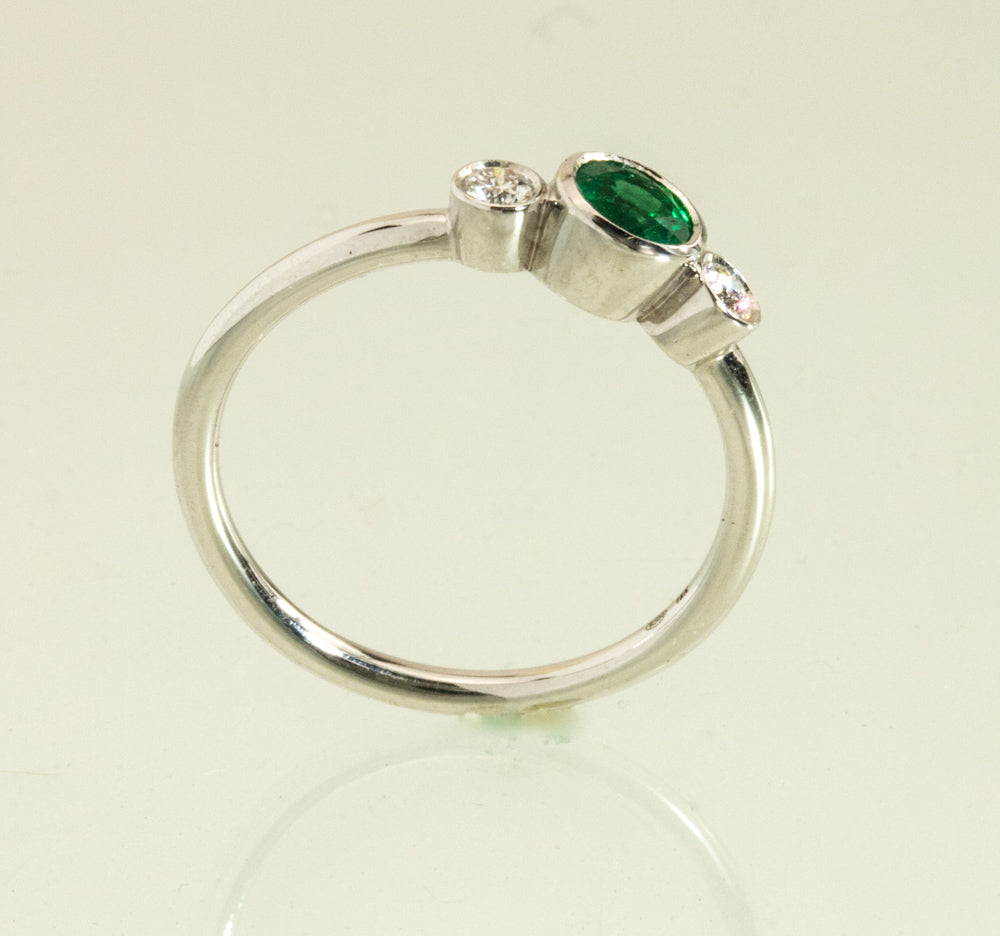 A .40 carat emerald and .12carat TW diamond ring. This bezel set ring is 18kt white gold and is a size 6 1/2. Sizing to fit is included.