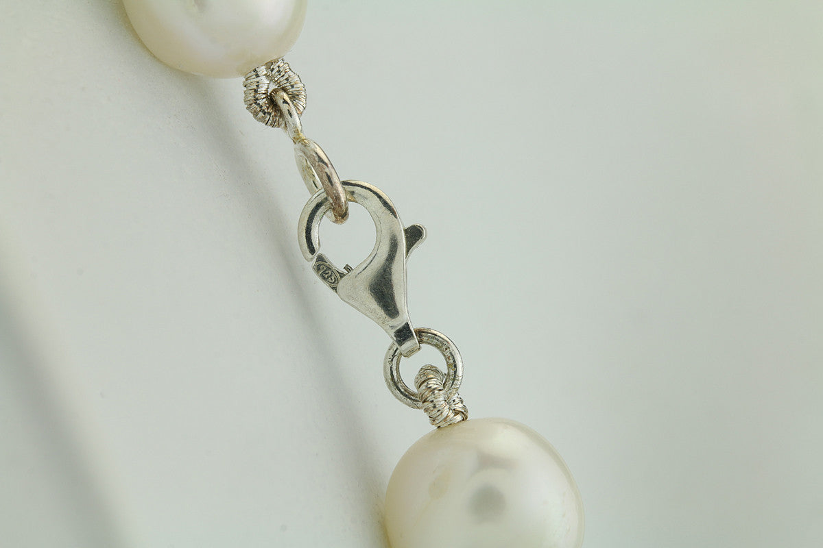 This necklace features white pearls of a high luster and a nugget shape. The pearls are 7-8mm X 9-9.5mm. The pearls are individually knotted and finished with a sterling silver fancy lobster clasp.