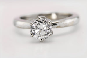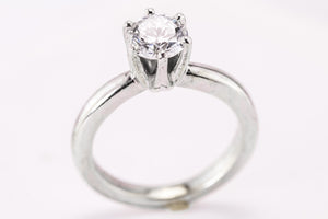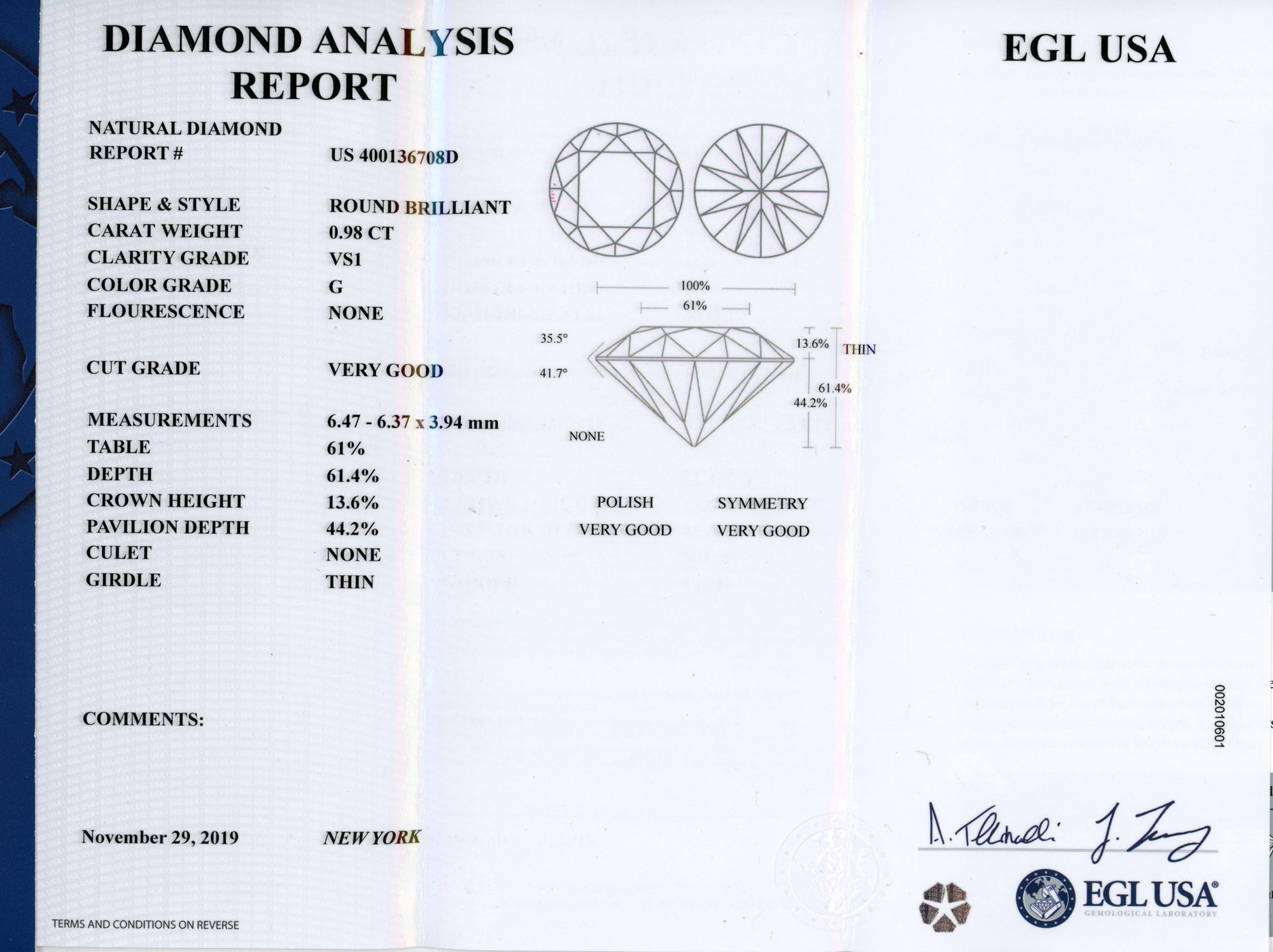 .98 carat diamond 14kt white gold solitaire. The diamond measures 6.47mm X 6.37mm in diameter with a depth of 3.94mm a color of G and a clarity of VS1. It has been certified by EGL laboratory with a report # 400136708D. The mounting is a heavy white gold 6 prong solitaire and includes sizing. 32-10244