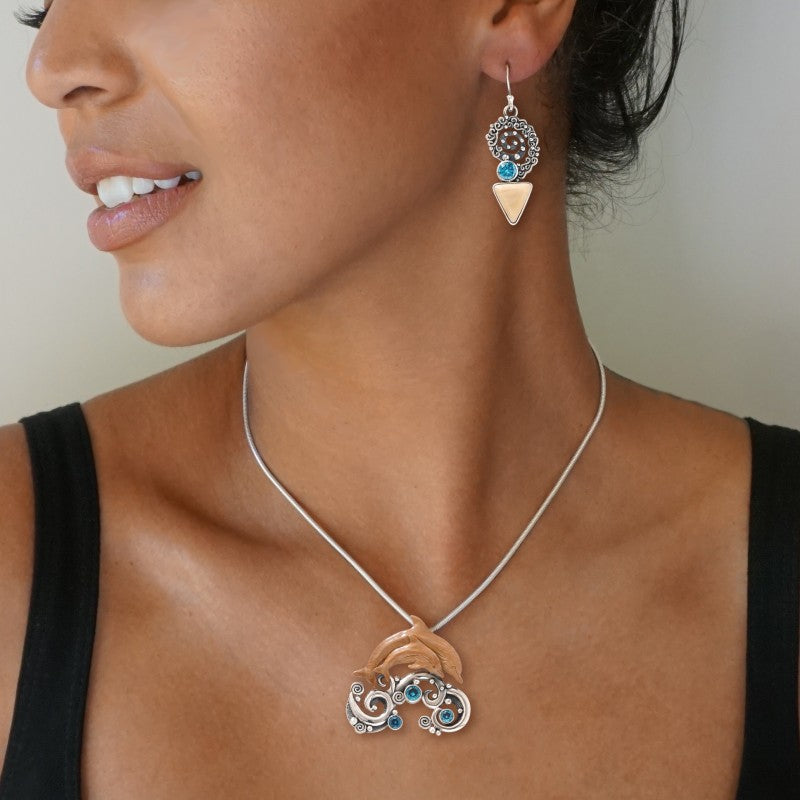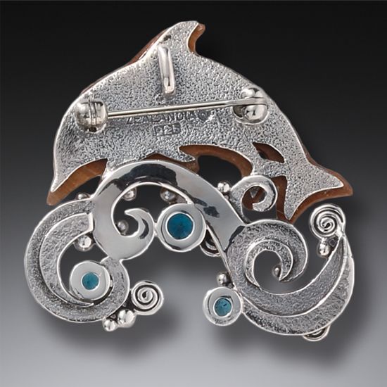 Blue topaz accents this dolphin themed pin for its aquatic color. It is an ideal accent to this dolphin pendant’s gleaming silver and earthen hues.