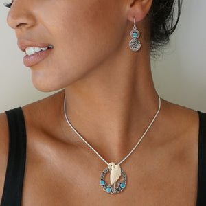 The graceful and fluid great egret takes center stage in this sterling silver and blue topaz necklace that showcases a hand carved ancient ivory bird in a stunning natural frame.
