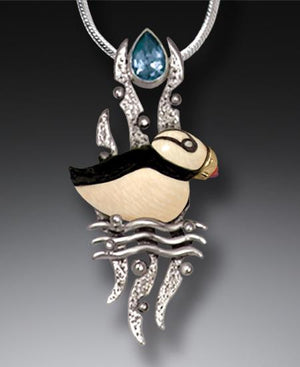 The beguiling puffin makes a delightful subject for this sparkling sterling silver and blue topaz pendant. These parrots of the sea are instantly recognizable for their prominent, vibrant beaks, which are only this large and colorful during the spring mating season. Winter sees a smaller, grey version of their signature feature.