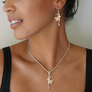 The bears’ bodies are hand carved from ancient mammoth ivory. This material tells an age-old story dating back millennia to when the great mammoths still roamed the earth. Their tusks have lain buried in the earth or permafrost for upwards of 15,000 years, coming to us whole or in pieces that are used in fine art works and craftsman carvings. To hold a piece of mammoth ivory in your hand is to step back in time. This lovely material makes a fine addition to our hanging bear earrings.