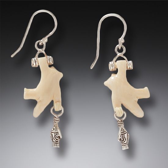 These whimsical fossilized ivory and silver bear earrings evoke a cub’s first summer fishing with their dangling accent and playful silhouette.