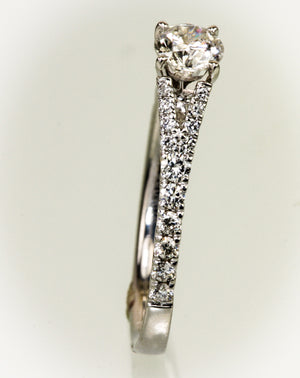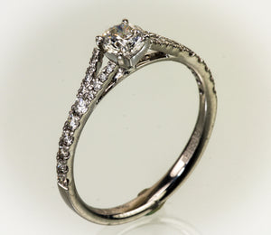 Platinum diamond ring set with a center .39 carat I SI3 round brilliant. Bead set on the shank are 28 full cut diamonds with a total weight of .26 carat. The current size is 7 and includes sizing.