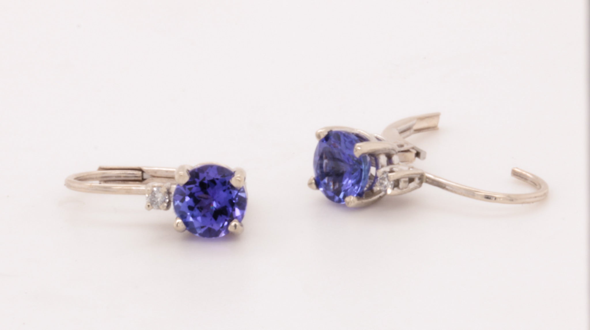 Tanzanite with diamond 14kt white gold earring. The tanzanite are 5mm in diameter with a total weight of .96 carat. The diamond total weight is .04carat. The setting is 14kt white gold basket settings on a leverback.